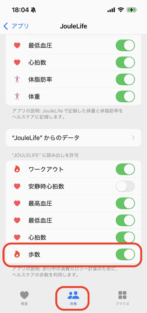iPhoneの「ヘルスケア」アプリですと、共有画面 > アプリ画面 を選択のうえ 、「JouleLife」の「歩数」がオン(緑色)になっていることを確認してください。緑色の場合でも、一旦オフ(グレー)にしたあと再度オン(緑色)に変更してください。